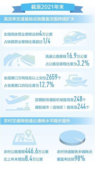 高效率交通基礎(chǔ)設(shè)施覆蓋范圍持續(xù)擴(kuò)大。截至2021年末,全國(guó)高鐵營(yíng)業(yè)里程達(dá)到4萬(wàn)公里,占鐵路營(yíng)業(yè)里程比重超過(guò)1/4。高速公路里程16.9萬(wàn)公里,比上年末增加8090公里,占公路總里程比重為3.2%,呈現(xiàn)穩(wěn)步提高態(tài)勢(shì)。全國(guó)港口萬(wàn)噸級(jí)及以上泊位2659個(gè)、增加67個(gè),占全國(guó)港口泊位比重為12.7%、提高1個(gè)百分點(diǎn)。定期航班通航機(jī)場(chǎng)、通航城市(或地區(qū))分別提高至248個(gè)和244個(gè)。