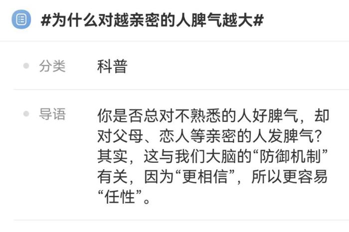 心理咨詢師楊琳瓊分析,潛意識中,我們知道對親近的人發(fā)脾氣會遭遇什么,這個風(fēng)險是可以接受的,并且這種親密關(guān)系不會因此而摧毀。