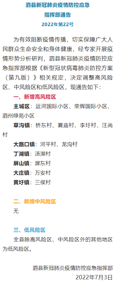 今日,安徽泗縣新冠肺炎疫情防控應(yīng)急指揮部發(fā)布通告,全縣范圍內(nèi)新增13個高風險區(qū)。詳情如下:為有效阻斷疫情傳播,切實保障廣大人民群眾生命安全和身體健康,經(jīng)專家開展疫情形勢分析研判,泗縣新冠肺炎疫情防控應(yīng)急指揮部根據(jù)《新型冠狀病毒肺炎防控方案(第九版)》相關(guān)規(guī)定,決定調(diào)整高風險區(qū)、中風險區(qū)和低風險區(qū),現(xiàn)通告如下: