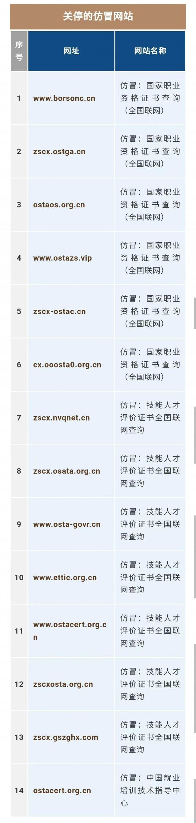 根據(jù)網(wǎng)絡(luò)巡查和群眾舉報(bào)情況,人力資源社會(huì)保障部聯(lián)合有關(guān)部門查實(shí)并關(guān)停了14個(gè)仿冒網(wǎng)站,其網(wǎng)站名稱、網(wǎng)址及頁面內(nèi)容與人力資源社會(huì)保障部技能類“職業(yè)資格證書”“職業(yè)技能等級(jí)證書”(以下簡稱技能類評價(jià)證書)查詢官方網(wǎng)站高度相似,容易誤導(dǎo)社會(huì)公眾。目前,上述14個(gè)網(wǎng)站均已被關(guān)停。
