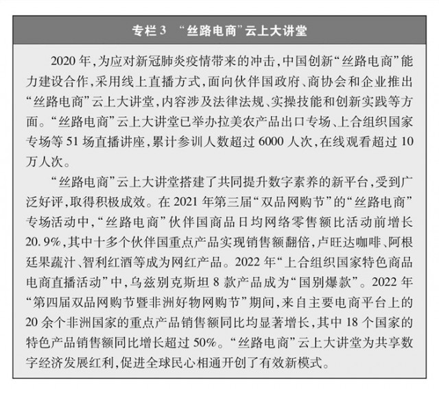 “絲路電商”合作成果豐碩。自2016年以來,中國與五大洲23個國家建立雙邊電子商務合作機制,建立中國-中東歐國家、中國-中亞五國電子商務合作對話機制,通過政企對話、聯(lián)合研究、能力建設等推動多層次交流合作,營造良好發(fā)展環(huán)境,構建數字合作格局。電子商務企業(yè)加速“出?!?,帶動跨境物流、移動支付等各領域實現(xiàn)全球發(fā)展。積極參與世界貿易組織、二十國集團、亞太經合組織、金磚國家、上合組織等多邊和區(qū)域貿易機制下的電子商務議題討論,與自貿伙伴共同構建高水平數字經濟規(guī)則。電子商務國際規(guī)則構建取得突破,區(qū)域全面經濟伙伴關系協(xié)定電子商務章節(jié)成為目前覆蓋區(qū)域最廣、內容全面、水平較高的電子商務國際規(guī)則。