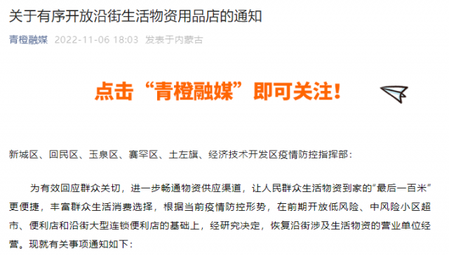 “青橙融媒”微信公眾號(hào)消息,呼和浩特市應(yīng)對(duì)新型冠狀病毒感染肺炎疫情防控工作指揮部市場(chǎng)管控組發(fā)布《關(guān)于有序開放沿街生活物資用品店的通知》,具體內(nèi)容如下。