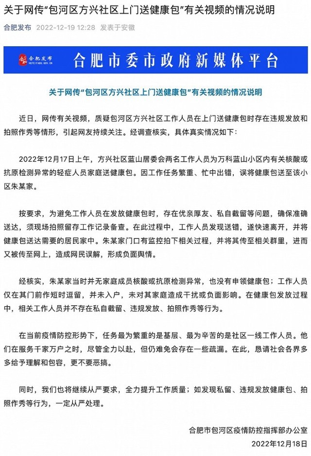 央視網(wǎng)消息:“合肥發(fā)布”微信公眾號12月19日消息,合肥市包河區(qū)疫情防控指揮部辦公室發(fā)布情況說明稱,近日,網(wǎng)傳有關(guān)視頻,質(zhì)疑包河區(qū)方興社區(qū)工作人員在上門送健康包時存在違規(guī)發(fā)放和拍照作秀等情形,引起網(wǎng)友持續(xù)關(guān)注。經(jīng)調(diào)查核實(shí),具體真實(shí)情況如下: