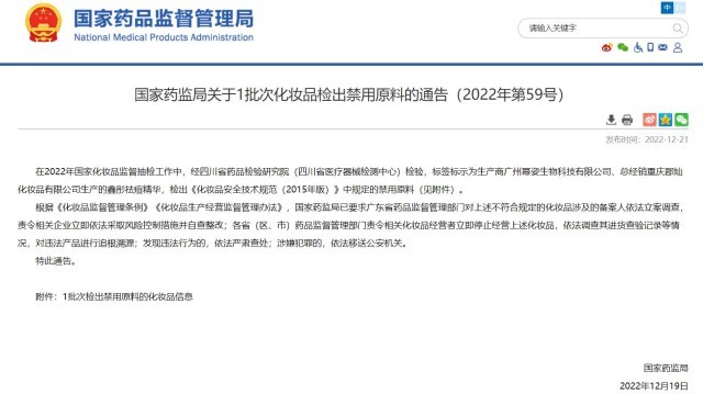 國(guó)家藥監(jiān)局官網(wǎng)消息,在2022年國(guó)家化妝品監(jiān)督抽檢工作中,經(jīng)四川省藥品檢驗(yàn)研究院(四川省醫(yī)療器械檢測(cè)中心)檢驗(yàn),標(biāo)簽標(biāo)示為生產(chǎn)商廣州冪姿生物科技有限公司、總經(jīng)銷重慶郡燦化妝品有限公司生產(chǎn)的鑫彤祛痘精華,檢出《化妝品安全技術(shù)規(guī)范(2015年版)》中規(guī)定的禁用原料。