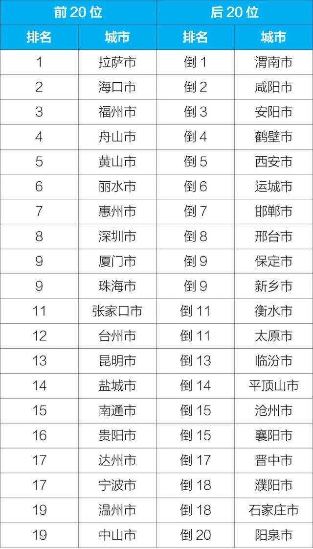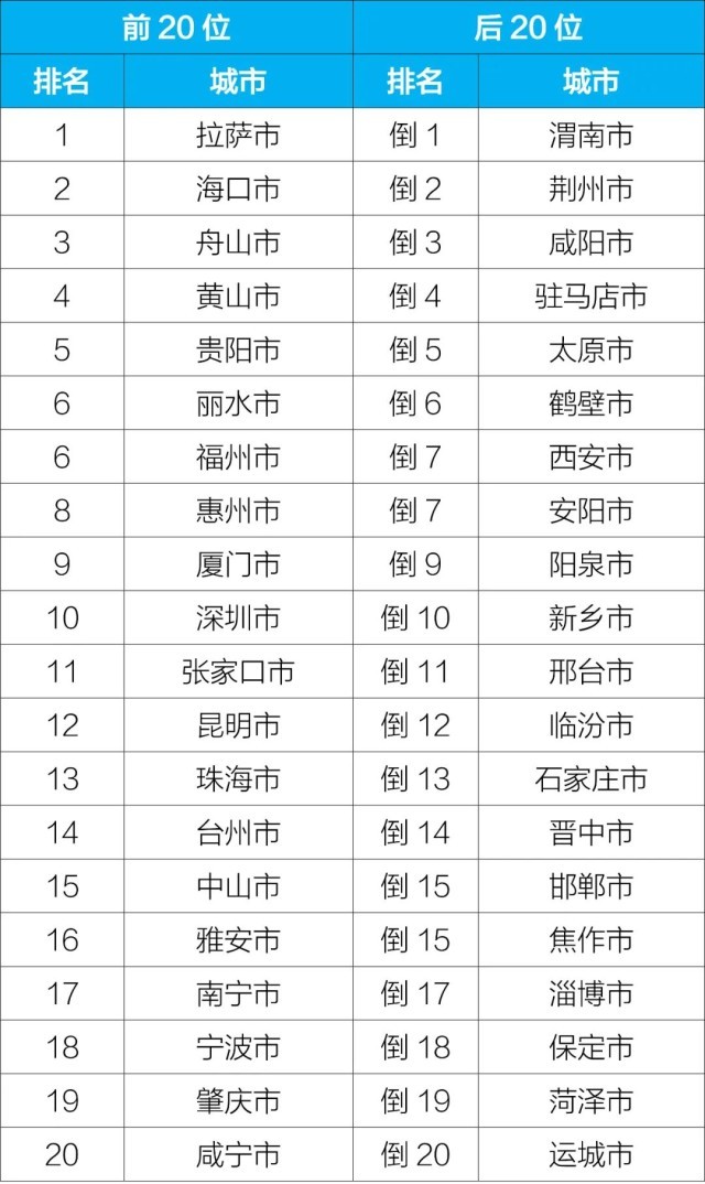 11月,168個(gè)重點(diǎn)城市中,拉薩、海口和福州市等城市空氣質(zhì)量相對(duì)較好(從第1名至并列第19名);渭南、咸陽和安陽市等城市空氣質(zhì)量相對(duì)較差(從倒數(shù)第1名至倒數(shù)第20名),見附表1。