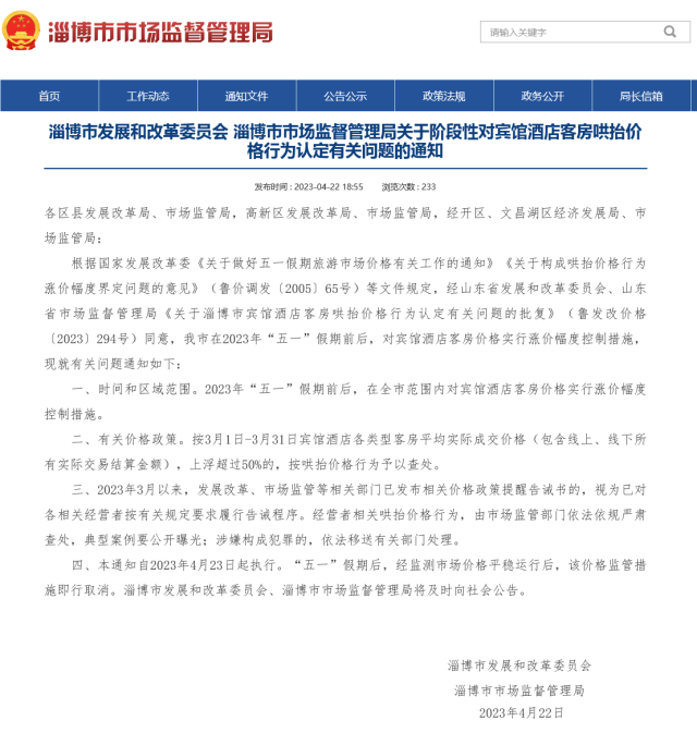 央視網(wǎng)消息:4月22日,淄博市發(fā)展和改革委員會(huì)、淄博市市場(chǎng)監(jiān)督管理局聯(lián)合發(fā)布《關(guān)于階段性對(duì)賓館酒店客房哄抬價(jià)格行為認(rèn)定有關(guān)問題的通知》(以下簡(jiǎn)稱《通知》)。《通知》明確,2023年“五一”假期前后,在全市范圍內(nèi)對(duì)賓館酒店客房?jī)r(jià)格實(shí)行漲價(jià)幅度控制措施。按3月1日至3月31日賓館酒店各類型客房平均實(shí)際成交價(jià)格(包含線上、線下所有實(shí)際交易結(jié)算金額),上浮超過50%的,按哄抬價(jià)格行為予以查處。通知全文如下: