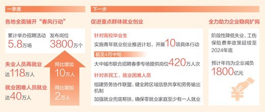 保重點,促進重點群體就業(yè)創(chuàng)業(yè)。針對高校畢業(yè)生,將實施促進高校畢業(yè)生等青年就業(yè)創(chuàng)業(yè)推進計劃,開展10項具體行動,著力拓展就業(yè)渠道、做實做細就業(yè)服務、強化困難兜底保障。截至4月中旬,大中城市聯(lián)合招聘春季專場提供崗位420萬人次。針對農(nóng)民工、就業(yè)困難人員,將組建勞務協(xié)作聯(lián)盟,健全跨區(qū)域信息共享和勞務輸出機制。加強困難群體就業(yè)兜底幫扶,確保零就業(yè)家庭至少有一人就業(yè)。