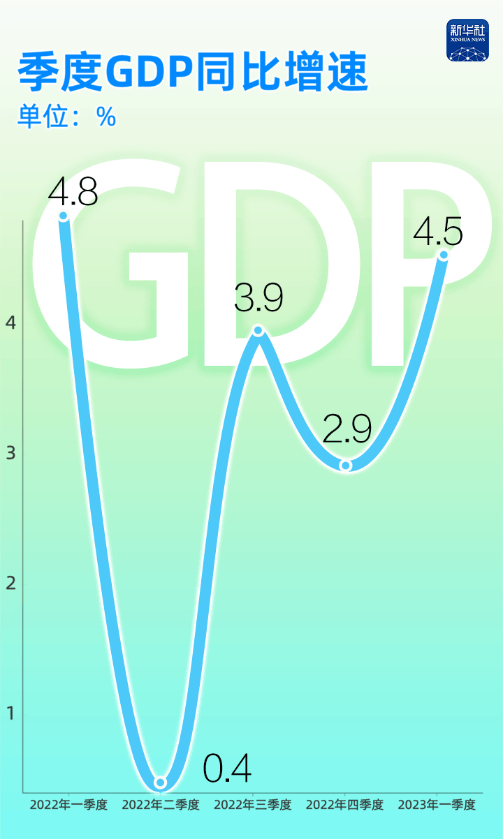 有數(shù)為證:2022年至今,我國(guó)的季度GDP同比增速分別為4.8%、0.4%、3.9%、2.9%和4.5%,一季度GDP增速達(dá)到了2022年二季度以來(lái)最高水平。