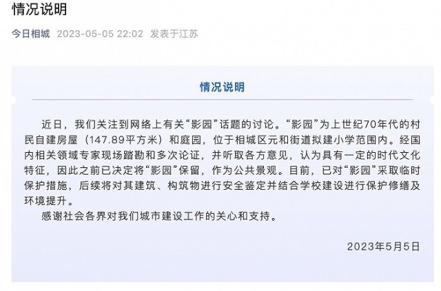 央視網(wǎng)消息:蘇州相城區(qū)委宣傳部公眾號“今日相城”5月5日發(fā)布情況說明稱,近日關注到網(wǎng)絡上有關“影園”話題的討論。“影園”為上世紀70年代的村民自建房屋(147.89平方米)和庭園,位于相城區(qū)元和街道擬建小學范圍內(nèi)。經(jīng)國內(nèi)相關領域?qū)<椰F(xiàn)場踏勘和多次論證,并聽取各方意見,認為具有一定的時代文化特征,因此之前已決定將“影園”保留,作為公共景觀。目前,已對“影園”采取臨時保護措施,后續(xù)將對其建筑、構(gòu)筑物進行安全鑒定并結(jié)合學校建設進行保護修繕及環(huán)境提升。