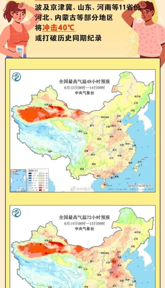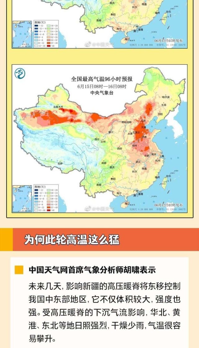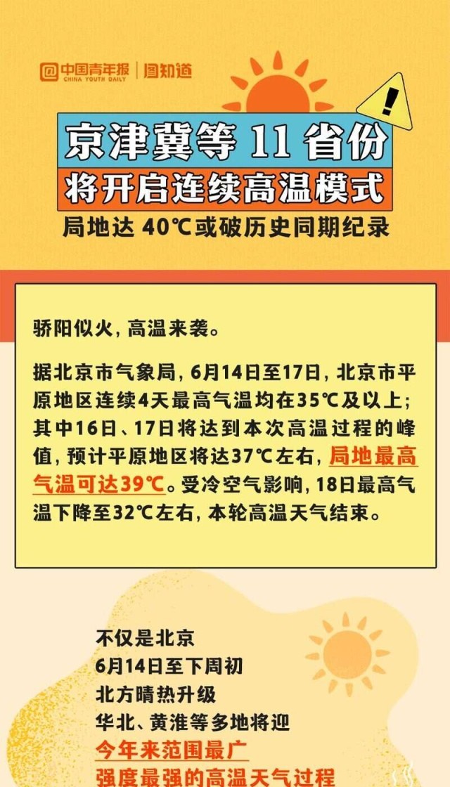 6月14日至下周初,華北、黃淮等多地將迎今年來范圍最廣、強(qiáng)度最強(qiáng)的高溫天氣過程,波及京津冀、山東、河南等11省份,河北、內(nèi)蒙古等部分地區(qū)將沖擊40℃,或打破歷史同期紀(jì)錄。全國(guó)總工會(huì)也發(fā)出提示,各級(jí)工會(huì)要督促用人單位提供必要的防護(hù)用品和高溫作業(yè)休息場(chǎng)所。為何這輪高溫這么猛?有哪些防范高溫天氣的建議?一起來看。