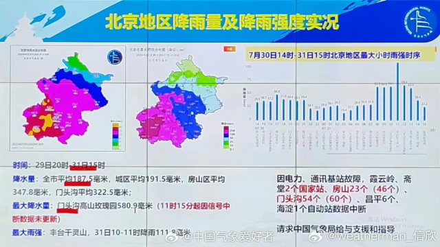 7月31日,微博賬號“中國氣象愛好者”發(fā)布消息稱,北京西部大量氣象站因特大暴雨導致電力通信和設備故障失聯(lián),目前北京西部雨情無法獲知,這是2012年“7·21”、2016年“7·20”暴雨過程都沒有出現(xiàn)過的嚴峻情況。