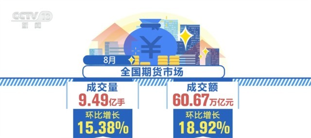 中國期貨業(yè)協(xié)會(huì)數(shù)據(jù)顯示,8月全國期貨市場(chǎng)成交量為9.49億手,成交額為60.67萬億元,同比分別增長47.76%和23.49%,環(huán)比分別增長15.38%和18.92%。