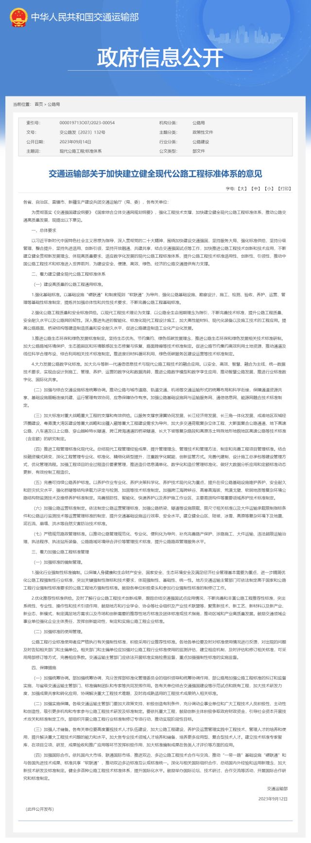 央視網(wǎng)消息:交通運輸部發(fā)布關于加快建立健全現(xiàn)代公路工程標準體系的意見。其中提出,大力發(fā)展公路數(shù)字化標準。加大北斗等新一代通信信息技術與現(xiàn)代公路工程技術的融合應用。以安全、高效、智慧、融合為主線,統(tǒng)一數(shù)據(jù)技術要求,實現(xiàn)由設計到施工、管理、養(yǎng)護、運營的數(shù)字化和數(shù)據(jù)流轉(zhuǎn),推進公路數(shù)字模型和數(shù)字孿生應用,推動智慧公路發(fā)展,推進行業(yè)標準數(shù)字化、國際化共享。