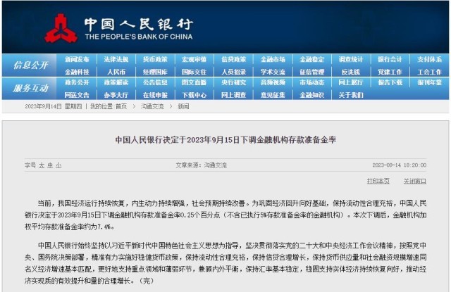 央視網(wǎng)消息:中國人民銀行9月14日公告,決定于2023年9月15日下調(diào)金融機構(gòu)存款準備金率0.25個百分點(不含已執(zhí)行5%存款準備金率的金融機構(gòu))。本次下調(diào)后,金融機構(gòu)加權(quán)平均存款準備金率約為7.4%。