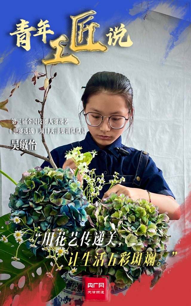 青春,是以工匠精神筑就美好生活的底色。走進位于天津農學院花藝(世賽選拔)項目的集訓現(xiàn)場,生機盎然、芬芳馥郁,天津集訓隊隊員吳敏怡正在挑選花材和花器,為每一件作品賦予一番獨特的意境。從2023年5月以來,吳敏怡每天要與花相伴12個小時,在審美及技術水平上的提高也讓她很有成就感。對于本次比賽,她也充滿期待:“我的目標是起碼能拿一個優(yōu)勝獎,也是為了突破自己,讓自己的花藝技術更上一層樓。”她說,她也將用花藝傳遞生活中的美,讓生活五彩斑斕。