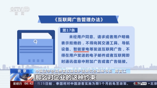 中國(guó)法學(xué)會(huì)消費(fèi)者權(quán)益保護(hù)法研究會(huì)副秘書(shū)長(zhǎng) 陳音江:廣告法里面規(guī)定得就比較粗一些,任何單位或個(gè)人,你沒(méi)有經(jīng)過(guò)當(dāng)事人的同意,不能夠向這種住宅或者說(shuō)交通設(shè)施上去投放廣告,但是用的是“等”,就沒(méi)有這么具體。修訂實(shí)施的《互聯(lián)網(wǎng)廣告管理辦法》里面,它就明確地說(shuō)了包括智能家電,你沒(méi)有經(jīng)過(guò)同意,你也不能夠往它里面去發(fā)送這種廣告。這幾年,針對(duì)智能家電的這種廣告它的規(guī)定越來(lái)越具體,那么對(duì)企業(yè)的這種約束也應(yīng)該是越來(lái)越具體,或者說(shuō)它這種合規(guī)的紅線(xiàn)越來(lái)越明確。