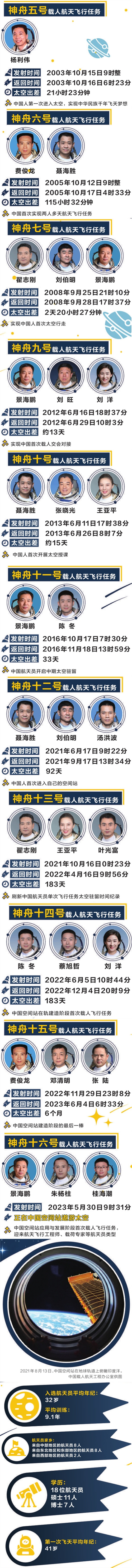 中國的航天員隊(duì)伍同樣經(jīng)歷了這樣的選拔和訓(xùn)練過程。2003年,中國航天史上第一位叩響宇宙之門的航天員楊利偉進(jìn)入太空,揭開了中國載人航天的新篇章。那之后,費(fèi)俊龍、聶海勝、翟志剛、劉伯明、景海鵬、劉洋、劉旺、王亞平、張曉光、陳冬、湯洪波、葉光富、蔡旭哲、鄧清明、張陸、朱楊柱、桂海潮……截至目前,一共18位中國航天員成功逐夢九天,太空一次又一次迎來中國人的身影。