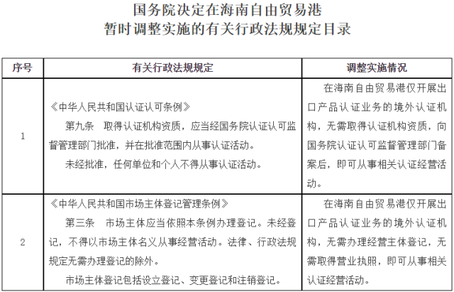 一、為支持海南自由貿(mào)易港建設,按照《海南自由貿(mào)易港建設總體方案》,同意自即日起在海南自由貿(mào)易港暫時調(diào)整實施《中華人民共和國認證認可條例》《中華人民共和國市場主體登記管理條例》有關規(guī)定(目錄附后),在海南自由貿(mào)易港僅開展出口產(chǎn)品認證業(yè)務的境外認證機構,無需取得認證機構資質(zhì)和辦理經(jīng)營主體登記,向國務院認證認可監(jiān)督管理部門備案后,即可開展出口產(chǎn)品認證業(yè)務,認證結(jié)果僅限出口企業(yè)境外使用。備案條件和程序由國務院認證認可監(jiān)督管理部門制定。