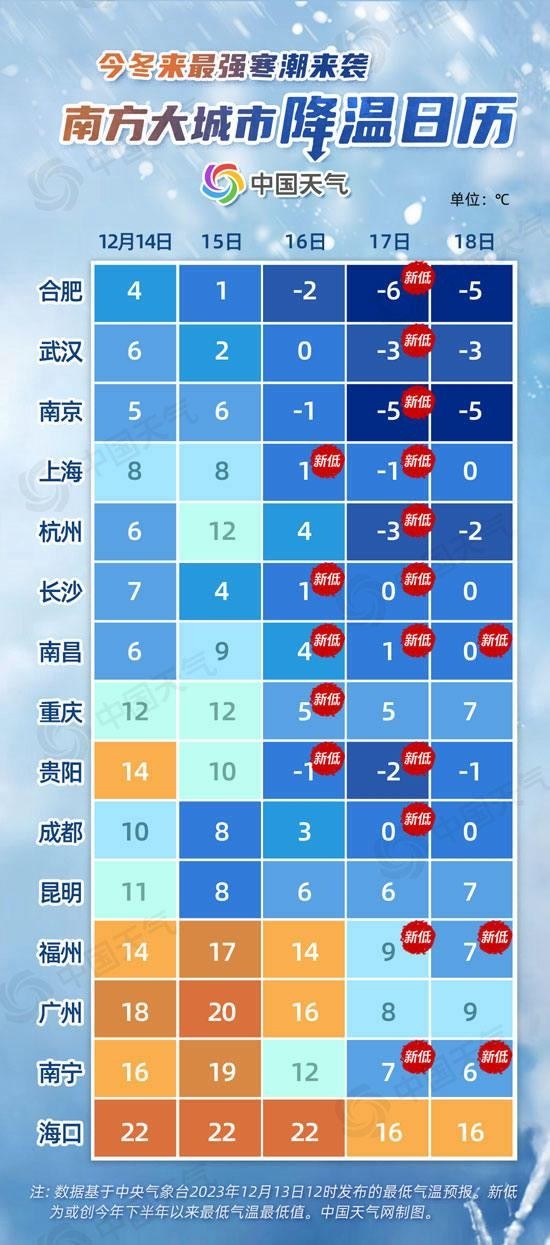 從南方大城市降溫日歷來看,未來五天,合肥、武漢、南京、上海、杭州、貴陽最低氣溫都將逐步下降到冰點(diǎn)以下。南昌16日至18日最低氣溫或連創(chuàng)新低,貴陽最低氣溫將從14℃降至-2℃,降幅可達(dá)16℃。