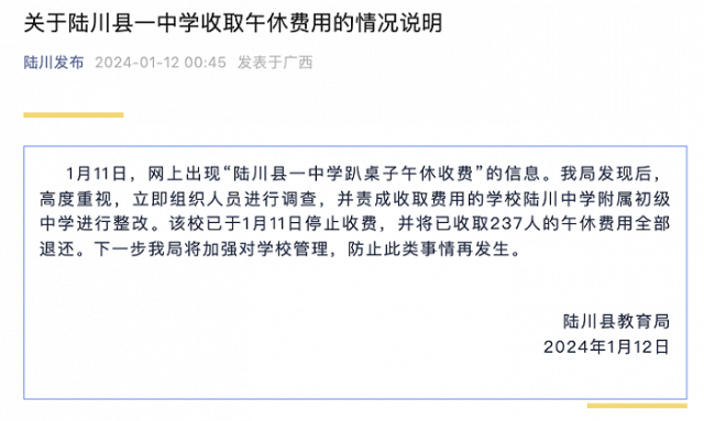 央視網(wǎng)消息:據(jù)“陸川發(fā)布”公眾號消息,1月12日,廣西陸川縣教育局通報關(guān)于一中學(xué)收取午休費用的情況說明:1月11日,網(wǎng)上出現(xiàn)“陸川縣一中學(xué)趴桌子午休收費”的信息,教育局立即組織人員進(jìn)行調(diào)查,并責(zé)成收取費用的學(xué)校陸川中學(xué)附屬初級中學(xué)進(jìn)行整改。該校已于1月11日停止收費,并將已收取237人的午休費用全部退還。下一步將加強(qiáng)對學(xué)校管理,防止此類事情再發(fā)生。