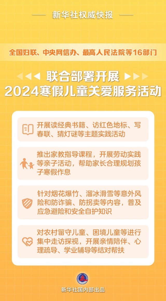 寒假即將到來(lái),全國(guó)婦聯(lián)、中央網(wǎng)信辦、最高人民法院、最高人民檢察院、教育部、公安部、民政部、司法部、國(guó)家衛(wèi)生健康委、應(yīng)急管理部、國(guó)家體育總局、國(guó)家疾控局、國(guó)家消防救援局、全國(guó)總工會(huì)、共青團(tuán)中央、中國(guó)關(guān)工委等16部門(mén)印發(fā)通知,圍繞思想引領(lǐng)潤(rùn)童心、家教指導(dǎo)育童心、安全教育護(hù)童心、愛(ài)心媽媽暖童心四個(gè)方面,聯(lián)合部署開(kāi)展“把愛(ài)帶回家——真情暖童心 相伴護(hù)成長(zhǎng)”2024寒假兒童關(guān)愛(ài)服務(wù)活動(dòng)。