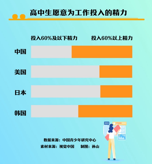 對(duì)于未來的工作,受訪高中生愿意投入多少精力?調(diào)查發(fā)現(xiàn),假設(shè)全部精力是100%,愿意為工作投入80%以上精力的中國高中生占比16.2%,愿意投入60%到80%精力的高中生占比43.8%,合計(jì)有六成受訪中國高中生愿意為工作投入60%以上精力,在四國受訪高中生中最高,其次是韓國高中生(53.3%),美國和日本高中生愿意投入60%以上精力的比例均只有三成多(32.4%和31.6%)??梢姡袊晚n國高中生更愿意投入較多精力在工作上。