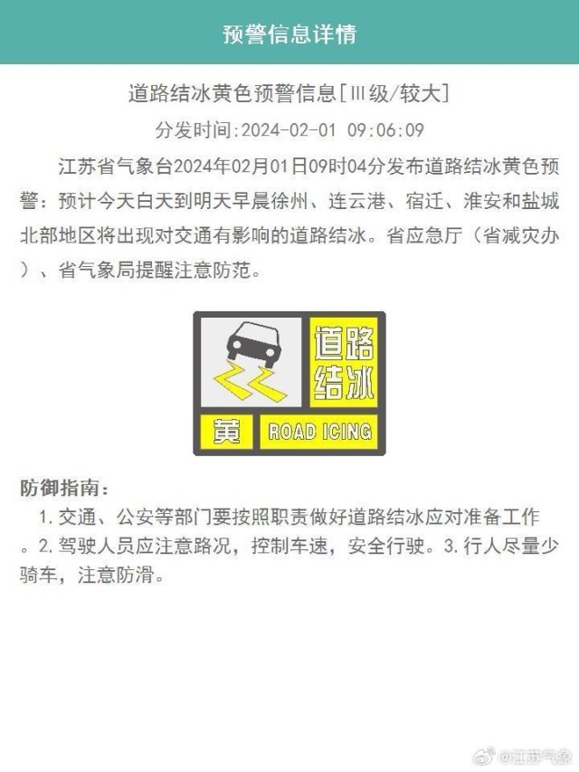 2月1日9時(shí)04分,江蘇省氣象臺(tái)發(fā)布道路結(jié)冰黃色預(yù)警: 預(yù)計(jì)今天白天到明天早晨,徐州、連云港、宿遷、淮安和鹽城北部地區(qū)將出現(xiàn)對(duì)交通有影響的道路結(jié)冰。江蘇省應(yīng)急廳(省減災(zāi)辦)、省氣象局提醒注意防范。