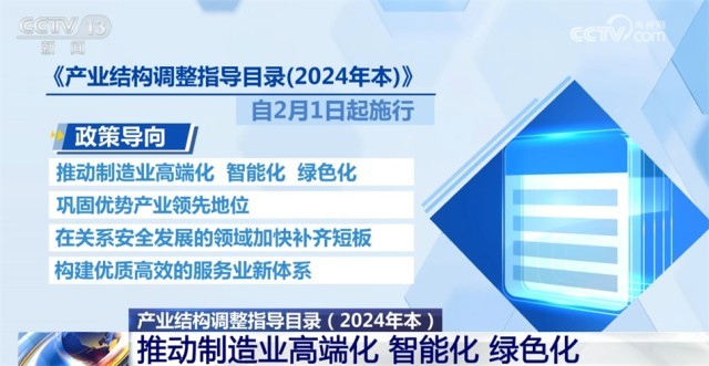 《產(chǎn)業(yè)結(jié)構(gòu)調(diào)整指導(dǎo)目錄(2024年本)》自2月1日起施行?!赌夸洠?024年本)》的政策導(dǎo)向是,推動制造業(yè)高端化、智能化、綠色化,鞏固優(yōu)勢產(chǎn)業(yè)領(lǐng)先地位,在關(guān)系安全發(fā)展的領(lǐng)域加快補齊短板,構(gòu)建優(yōu)質(zhì)高效的服務(wù)業(yè)新體系。