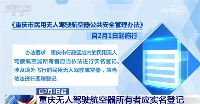 《重慶市民用無人駕駛航空器公共安全管理辦法》自2月1日起施行。辦法要求,重慶市行政區(qū)域內(nèi)的民用無人駕駛航空器所有者應(yīng)當(dāng)依法進(jìn)行實名登記。涉及境外飛行的民用無人駕駛航空器,應(yīng)當(dāng)依法進(jìn)行國籍登記。