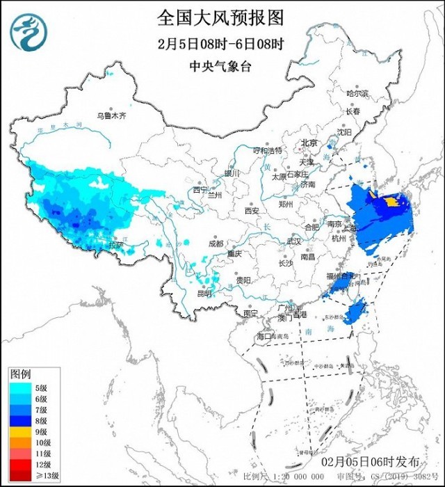 預(yù)計(jì),2月5日08時至6日08時,西藏中西部、青海西南部等地將有5~7級、陣風(fēng)8級的大風(fēng);黃海南部海域、東海大部海域、臺灣海峽、巴士海峽將有7~8級、陣風(fēng)9級的大風(fēng),其中黃海東南部、東海東北部的部分海域風(fēng)力可達(dá)9級、陣風(fēng)10級。