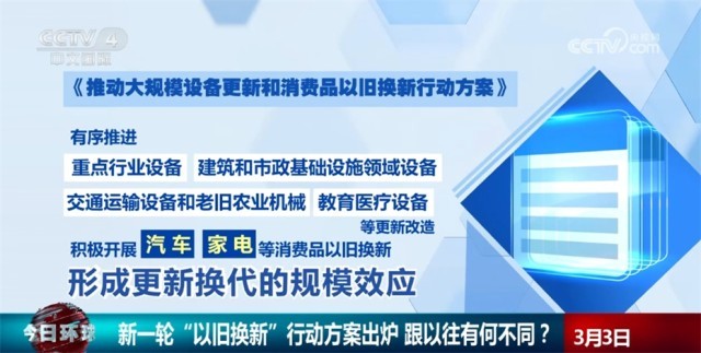 央視網(wǎng)消息:日前,國務(wù)院常務(wù)會議審議通過了《推動大規(guī)模設(shè)備更新和消費(fèi)品以舊換新行動方案》。行動方案有哪些亮點(diǎn)?新一輪“以舊換新”和以往有什么不同?來看專家的解讀。