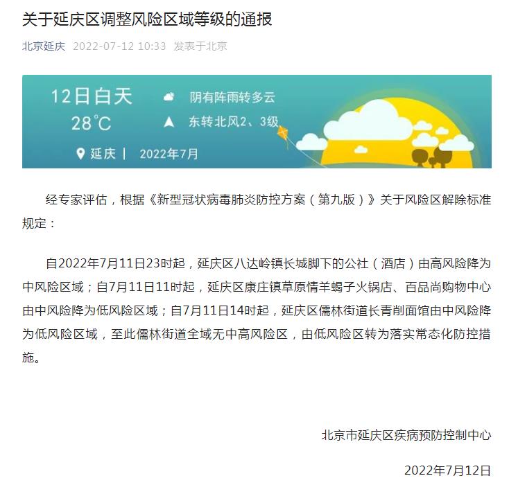 中新網(wǎng)7月12日電 據(jù)“北京延慶”微信公眾號消息,北京市延慶區(qū)疾病預(yù)防控制中心12日發(fā)布通報稱,經(jīng)專家評估,根據(jù)《新型冠狀病毒肺炎防控方案(第九版)》關(guān)于風(fēng)險區(qū)解除標(biāo)準(zhǔn)規(guī)定:自2022年7月11日23時起,延慶區(qū)八達(dá)嶺鎮(zhèn)長城腳下的公社(酒店)由高風(fēng)險降為中風(fēng)險區(qū)域;自7月11日11時起,延慶區(qū)康莊鎮(zhèn)草原情羊蝎子火鍋店、百品尚購物中心由中風(fēng)險降為低風(fēng)險區(qū)域;自7月11日14時起,延慶區(qū)儒林街道長青削面館由中風(fēng)險降為低風(fēng)險區(qū)域,至此儒林街道全域無中高風(fēng)險區(qū),由低風(fēng)險區(qū)轉(zhuǎn)為落實(shí)常態(tài)化防控措施。