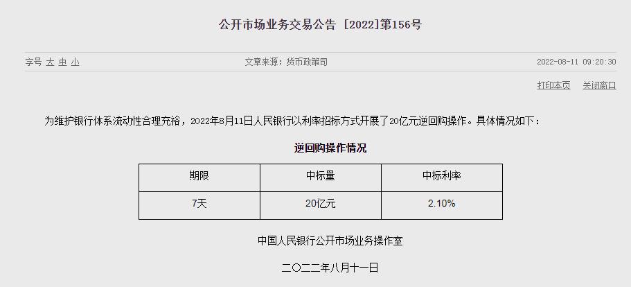 中新網(wǎng)8月11日電 據(jù)央行網(wǎng)站11日消息,為維護銀行體系流動性合理充裕,2022年8月11日人民銀行以利率招標方式開展了20億元逆回購操作。中標利率為2.10%。(中新財經(jīng))