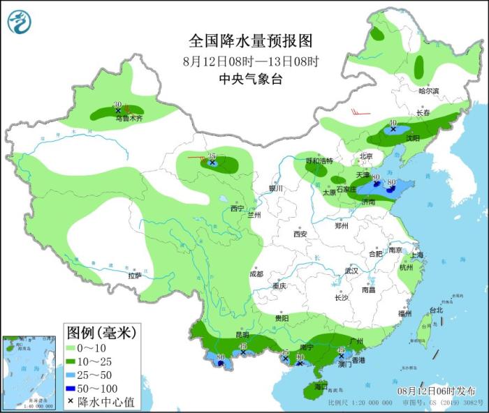8月12日08時至13日08時,內(nèi)蒙古東南部、吉林東部、遼寧北部、新疆沿天山地區(qū)、甘肅河西、陜西北部、河北南部、山東中北部、云南南部、華南南部和海南島等地部分地區(qū)有中到大雨,其中,山東北部、云南西南部、廣西南部沿海等地部分地區(qū)有暴雨(50~90毫米)。內(nèi)蒙古中部、甘肅河西等地部分地區(qū)有4~6級風(fēng)。