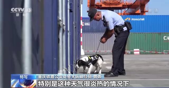 上午9點,戶外的氣溫已高達37℃。在重慶團結(jié)村中心站,一批集裝箱馬上要搭乘中歐班列出發(fā)。重慶鐵路公安處鐵警陳城帶著他的防爆犬“閃電”正在對這批貨進行最后的防爆檢驗。