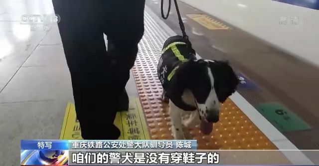 重慶鐵路公安處警犬隊馴導員 陳城:現(xiàn)在地表溫度是非常高的,你看現(xiàn)在都是接近60℃了,咱們的警犬是沒有穿鞋子的,相當于就是(它的)肉墊直接接觸地面,它是非常痛苦的,所以咱們(正午)基本上不會在室外工作了。