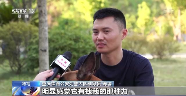 重慶鐵路公安處警犬隊馴導員 陳城:有一次我們出去找一個人的時候,在山林里搜救,我在行進的途中不小心差點摔下去了,因為拽著(閃電的)警繩,明顯感覺它有拽我的那種力,把我拖上去的感覺挺感動的,當時內(nèi)心有一顫。
