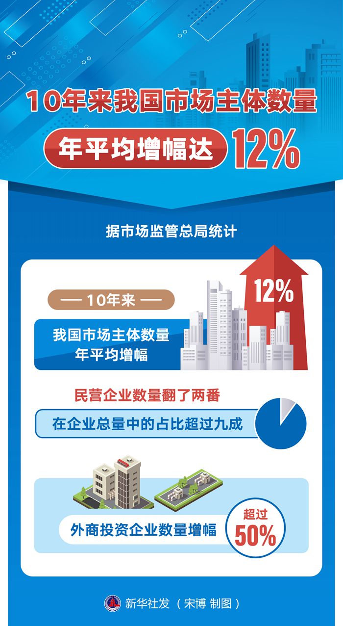 新華社北京10月13日電(記者趙文君)據(jù)市場監(jiān)管總局統(tǒng)計,10年來,我國市場主體數(shù)量年平均增幅達12%;民營企業(yè)數(shù)量翻了兩番,在企業(yè)總量中的占比超過九成;外商投資企業(yè)數(shù)量增幅超過50%。