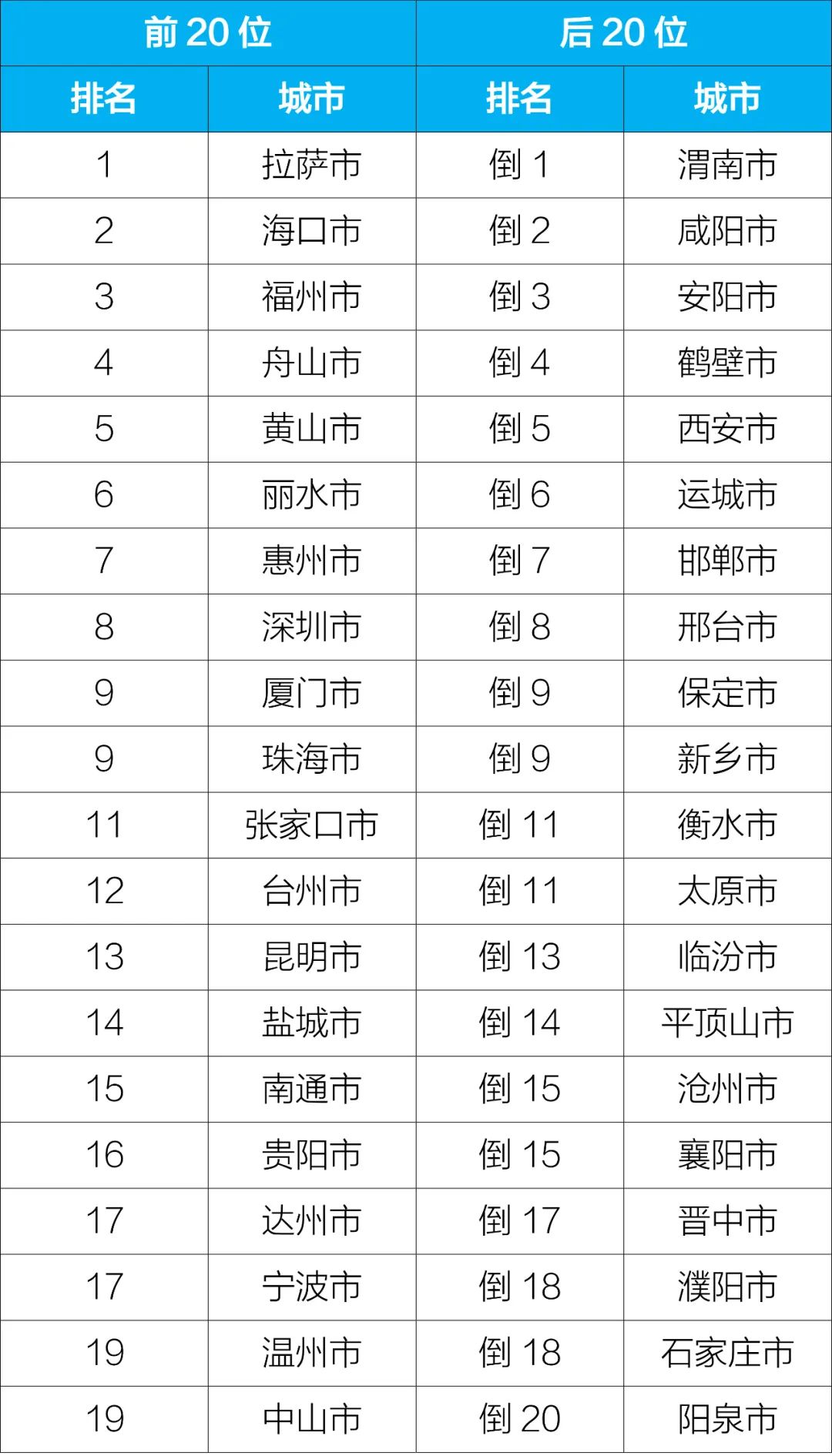1—11月,168個重點(diǎn)城市中,拉薩、??诤椭凵绞械瘸鞘锌諝赓|(zhì)量相對較好(從第1名至第20名);渭南、荊州和咸陽市等城市空氣質(zhì)量相對較差(從倒數(shù)第1名至倒數(shù)第20名),見附表2。