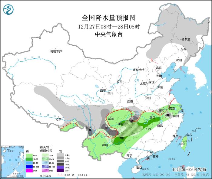 12月27日08時(shí)至28日08時(shí),內(nèi)蒙古東部、黑龍江和吉林大部、西藏東部、湖北西部、湖南西部、貴州中北部、重慶東南部、川西高原、云南北部以及安徽大別山區(qū)和皖南山區(qū)等地部分地區(qū)有小到中雪,其中,安徽皖南山區(qū)、湖北西南部、川西高原南部、重慶東南部、貴州西北部、云南北部等地部分地區(qū)有大到暴雪(10~15毫米)。湖北中東部、湖南中東部、安徽南部、江蘇南部、浙江北部、江西西北部、廣西中西部、云南中南部、臺(tái)灣島等地部分地區(qū)有小到中雨。內(nèi)蒙古中部、河北北部部分地區(qū)有4~5級(jí)風(fēng)。東海南部海域、臺(tái)灣海峽、巴士海峽、南海大部海域、北部灣將有6~7級(jí)、陣風(fēng)8級(jí)的偏北或東北風(fēng),其中臺(tái)灣海峽、南海東北部的部分海域風(fēng)力可達(dá)8級(jí)、陣風(fēng)9級(jí)(見(jiàn)圖2)。