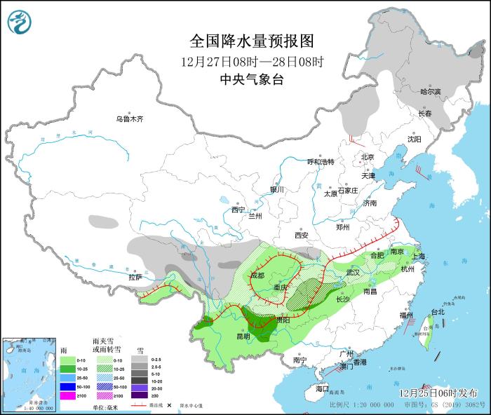 12月27日08時至28日08時,內(nèi)蒙古東部、東北地區(qū)大部、西藏北部和東部、貴州中北部、湖南西北部、湖北西部和南部等地部分地區(qū)有小到中雪或雨夾雪,其中,西藏東南部等地部分地區(qū)有大雪。西藏東南部、江淮東部和西部、江南北部、西南地區(qū)南部、廣西西北部、臺灣島等地部分地區(qū)有小雨,其中,湖南中西部、貴州西南部、云南東部和西南部、廣西西北部等地部分地區(qū)有中雨。河北北部部分地區(qū)有4~5級風。臺灣海峽、巴士海峽、南海大部海域、北部灣將有6~7級、陣風8級的東北風。