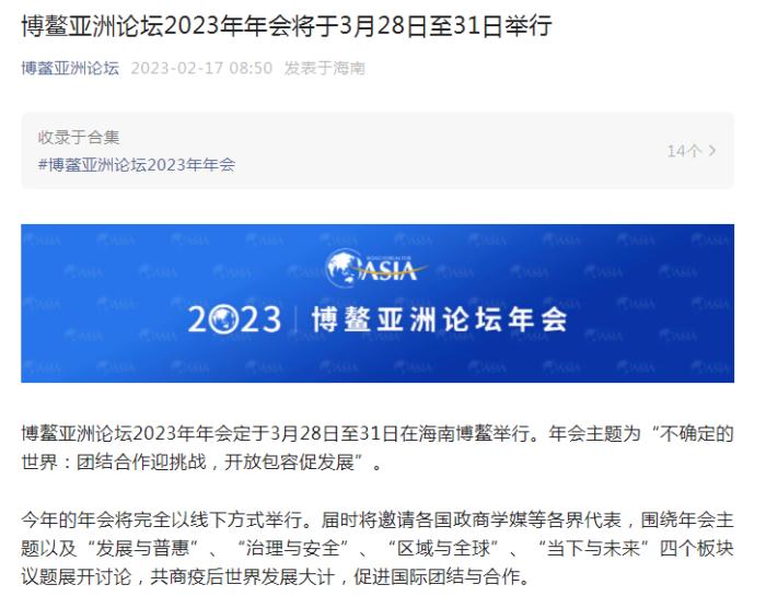 博鰲亞洲論壇2023年年會(huì)將于3月28日至31日舉行