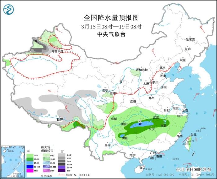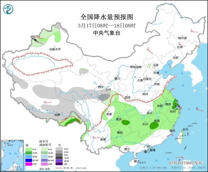 3月16日08時至17日08時,新疆沿天山地區(qū)和伊犁河谷、西藏東部和南部、青海東部和南部、川西高原等地部分地區(qū)有小到中雪或雨夾雪,局地有大雪(5~7毫米)。黃淮西部、江淮西部、江漢、江南北部和西部、西南地區(qū)東部等地部分地區(qū)有中到大雨,其中,貴州東部、湖南北部等地局地有暴雨(50~80毫米)。內(nèi)蒙古中東部、東北地區(qū)、浙江北部等地部分地區(qū)有4~6級風(fēng)。