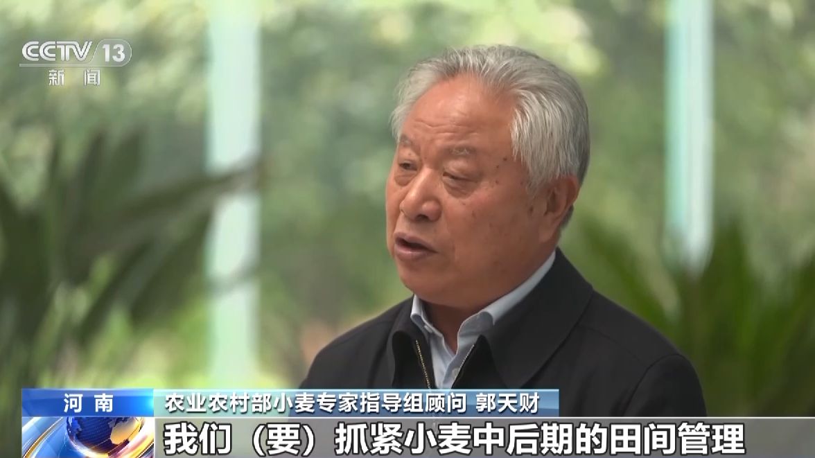 農(nóng)業(yè)農(nóng)村部小麥專家指導(dǎo)組顧問 郭天財:我們要抓緊小麥中后期的田間管理,一個措施一個措施地把它落實落地,一個環(huán)節(jié)一個環(huán)節(jié),我們把它抓緊抓好,來鞏固和發(fā)展當前苗情持續(xù)向好的態(tài)勢,今年小麥豐收還是很有希望的。
