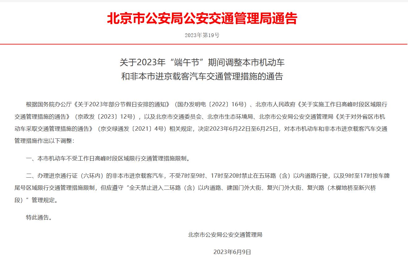 北京:2023年端午節(jié)期間機動車尾號不限行