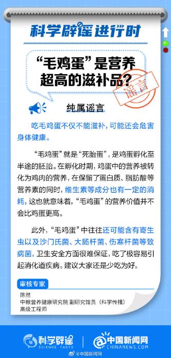 純屬謠言!“毛雞蛋”就是“死胎蛋”,是雞蛋孵化至半途的胚胎?!懊u蛋”的營養(yǎng)價值并不比雞蛋更高,其中還可能含有寄生蟲以及沙門氏菌、大腸桿菌、傷寒桿菌等致病菌,衛(wèi)生安全很難保證,吃了極容易引起消化道疾病。(來源:科學(xué)辟謠、中國新聞網(wǎng)微博)