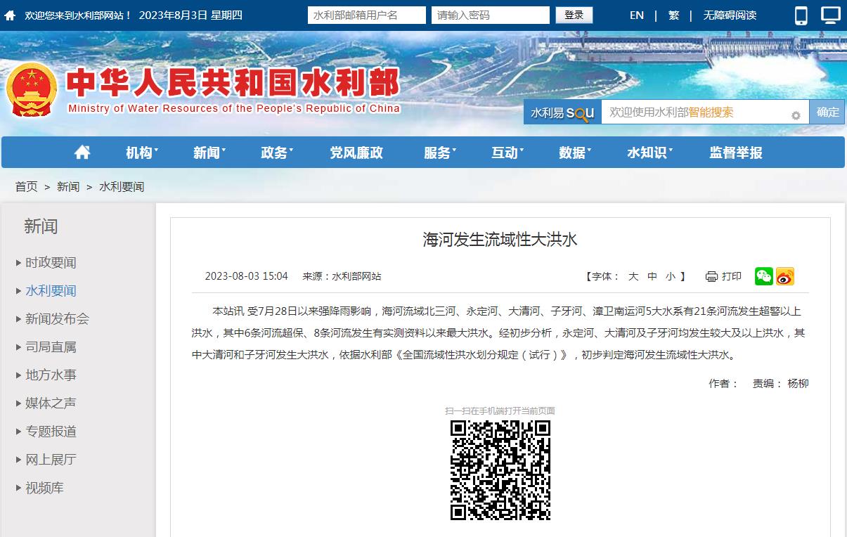 中新網8月3日電 據水利部網站3日消息,受7月28日以來強降雨影響,海河流域北三河、永定河、大清河、子牙河、漳衛(wèi)南運河5大水系有21條河流發(fā)生超警以上洪水,其中6條河流超保、8條河流發(fā)生有實測資料以來最大洪水。經初步分析,永定河、大清河及子牙河均發(fā)生較大及以上洪水,其中大清河和子牙河發(fā)生大洪水,依據水利部《全國流域性洪水劃分規(guī)定(試行)》,初步判定海河發(fā)生流域性大洪水。