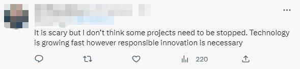 還有人分析,“這很可怕,但我認為有些項目不需要停止。技術(shù)正在發(fā)展迅速,負責任的創(chuàng)新也是必要的?!?/p>