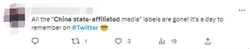 有網(wǎng)友稱,“所有‘中國官方媒體’的標(biāo)簽都消失了!這是推特上值得紀(jì)念的一天。”