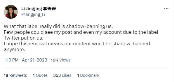 中國英文主持人李菁菁指出,推特的“官媒”標(biāo)簽實際是一種“影子禁令”,為暗中設(shè)限提供方便?!坝捎谕铺亟o我們貼上了標(biāo)簽,很少有人能看到我的帖子,甚至很難找到我的賬號。我希望這次刪除(標(biāo)簽)意味著我們發(fā)布的內(nèi)容不會再被暗中禁止。”